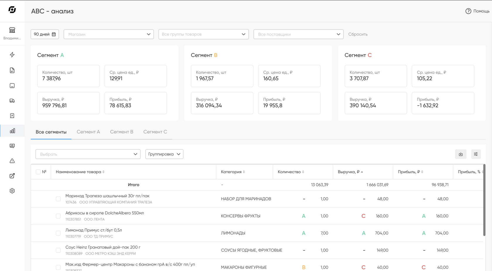 Начните со «скелета»: определите категории и подкатегории, назначьте роли SKU — «локомотив» (трафик), «якорь маржи» (высокая наценка при умеренной оборачиваемости), «дополняющий» (усиливает корзину). После этого каждый отчёт «видит» структуру и помогает принимать решения по ролям, а АВС-анализ в один клик показывает, что приносит прибыль внутри группы. На «Главной» это продублировано виджетами — удобно для ежедневного контроля без углубления в BI.