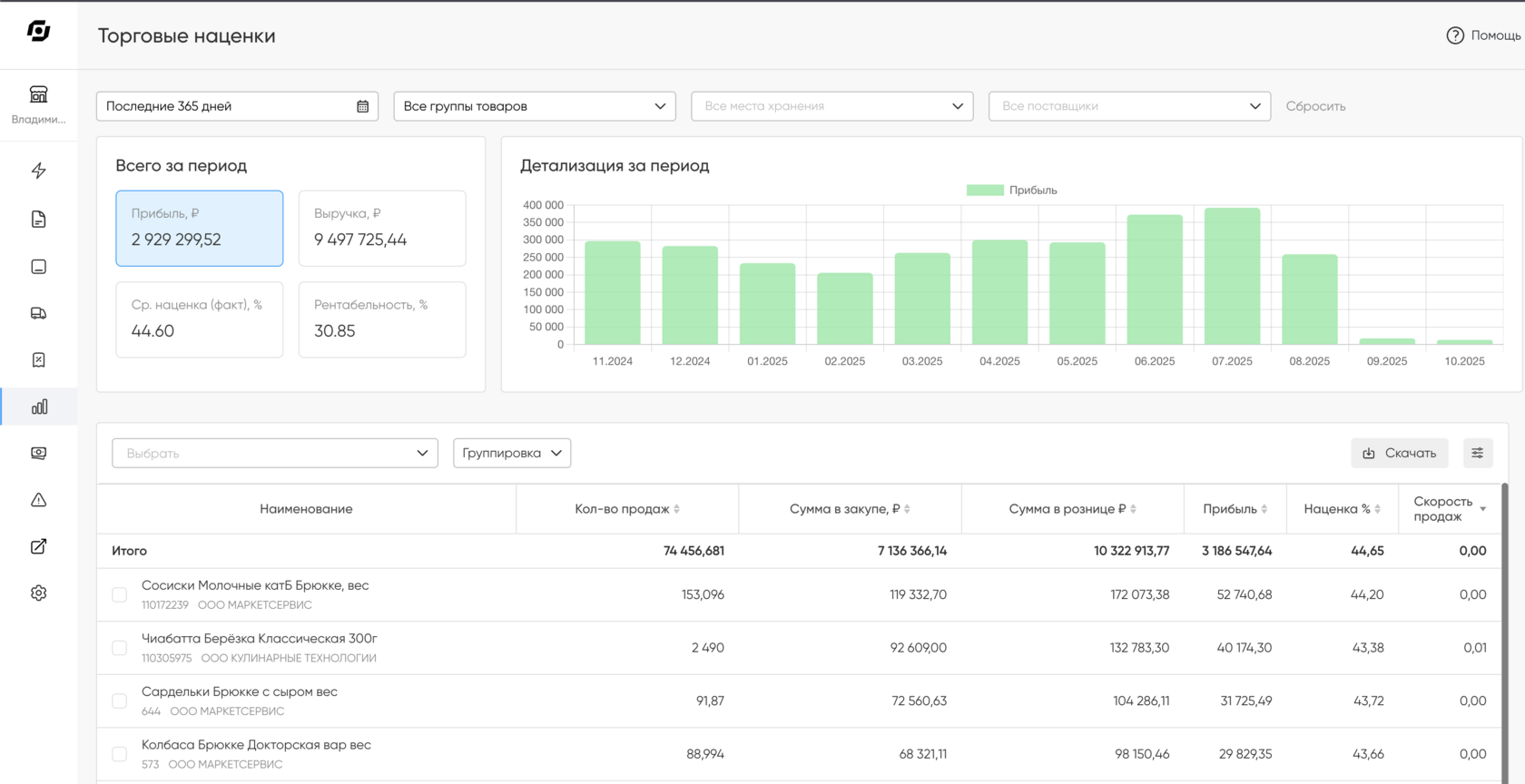 Для регулярной проверки подойдёт отчёт «Торговые наценки». В блоке «Всего за период» видно прибыль, выручку, среднюю фактическую наценку и рентабельность; в таблице — «Сумма в закупе», «Розница без скидки», «Наценка без скидки», «Скорость продаж» и гибкая группировка по магазину, поставщику, товарной группе и месту хранения. Такой срез быстро показывает, где маржа держится за счёт цены, а где — «съедается» скидками.