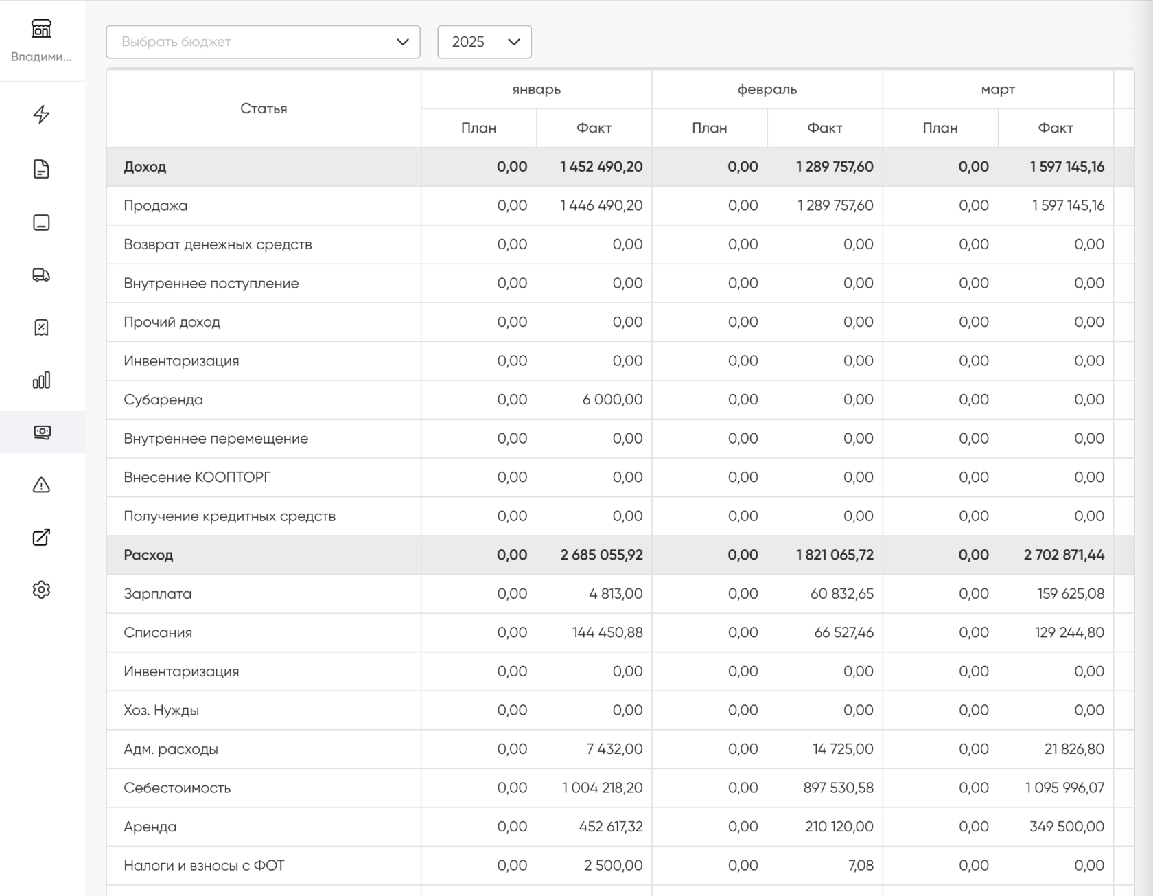 - Оплаты → План платежей — календарь обязательств: договоры + неоплаченные приходы + уже внесённые платежи.